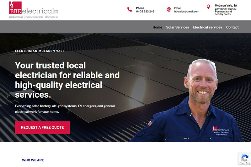 BBE Electrical McLaren Vale, McLaren Vale, SA. A professional service website for electrical solutions, designed to build trust with clear service offerings across solar, EV chargers and general electrical work for homes. Visit website →