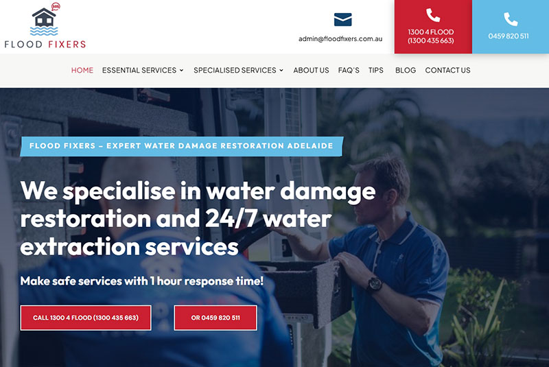 Flood Fixers – Adelaide, SA. A clean and responsive website offering comprehensive water damage restoration services for homes and commercial properties including 24/7 emergency service with fast response times and customer-focused solutions. Visit website →