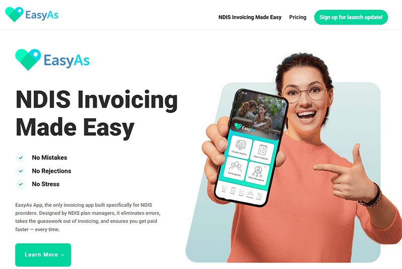 Easy As Invoicing, Adelaide. A clean, approachable website built for a small business simplifying invoicing for NDIS in Australia. The site presents the service clearly with easy navigation, straightforward messaging, and a focus on encouraging sign-ups. Visit website →
