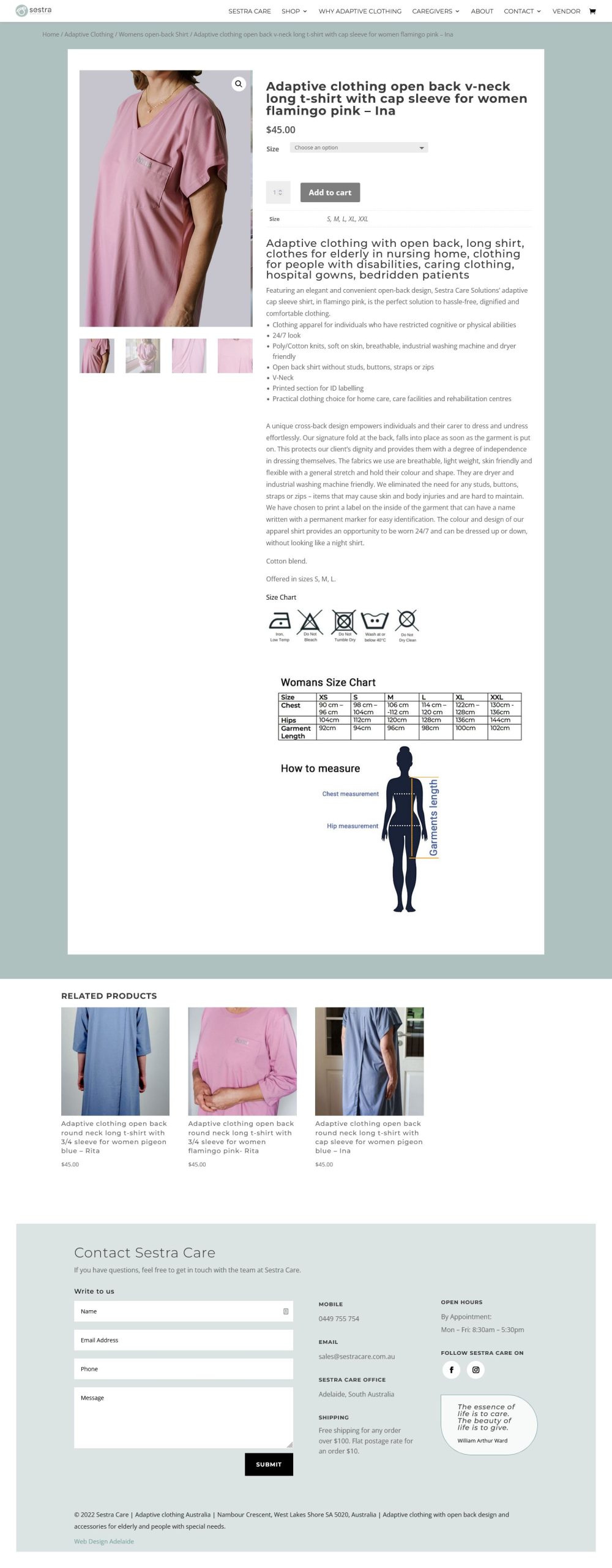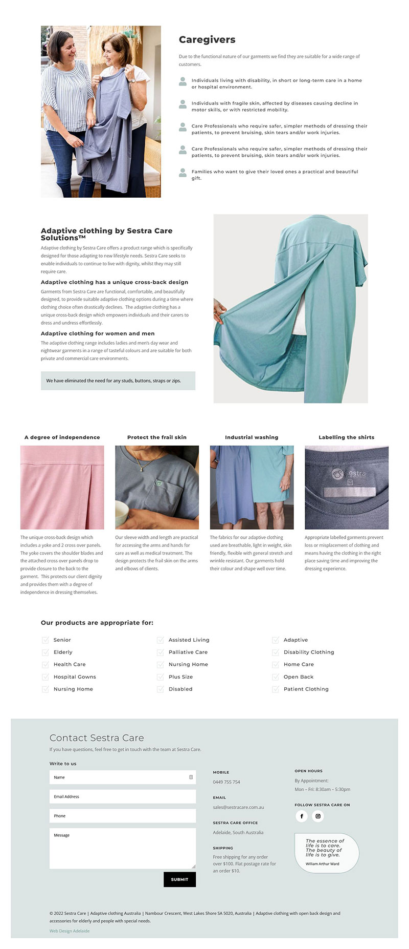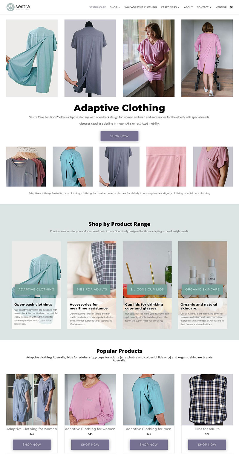 Sestra Care, based in Adelaide, Australia, provides adaptive clothing and accessories to meet the unique needs of the elderly and individuals with disabilities. Our open-back design shirt options for women and men, as well as bibs for adults and silicone cup lids, are designed to aid those living in a home or hospital setting or dealing with diseases affecting their mobility.