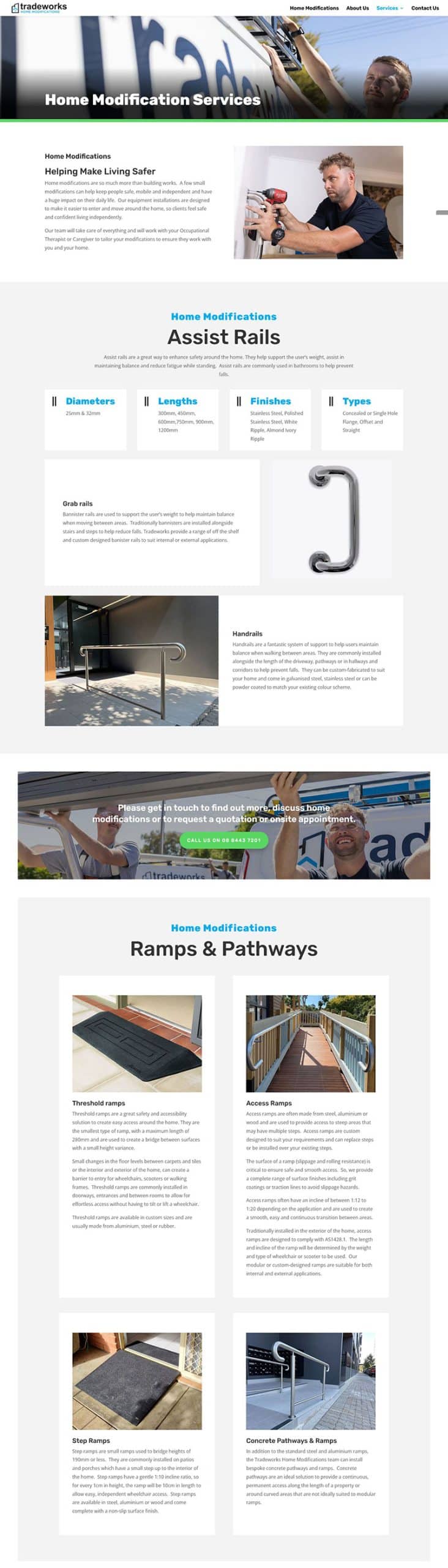 He wanted a clean and modern website that looked good on a phone, tablet or computer and highlighted the broad range of home modification services the company could offer. The website has 4 pages including a service page with a long drop-down menu so you can quickly and easily find information on any of the 8 different home modifications that Tradeworks offer.